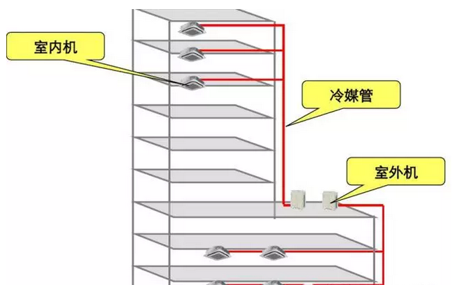 多聯(lián)機俗稱“一拖多”,多聯(lián)機系統(tǒng)是一臺室外機連接多臺室內(nèi)機,每臺室內(nèi)機可以自由地運轉(zhuǎn)/停止、或群組、或集中等控制。它由制冷劑管路連接的室外機和室內(nèi)機組成,室外機由室外側(cè)換熱器、壓縮機和其他制冷劑附件組成;室內(nèi)機由風(fēng)機和直接蒸發(fā)器等組成。一臺室外機通過管路能夠向若干個室內(nèi)機輸送制冷劑液體,通過控制壓縮機的制冷劑循環(huán)量和進(jìn)入室內(nèi)各個換熱器的制冷劑流量,同時適時地滿足室內(nèi)冷熱負(fù)荷要求。